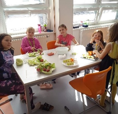 Juli Ch.: Vařili jsme špejlové růže a Lucka s Eliškou dělaly ovocné špízy.