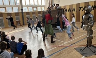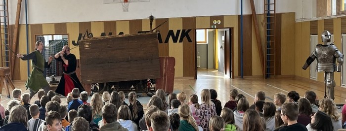 Ve čtvrtek 13. listopadu naši školu navštívil divadelní spolek Pernštejni s představením ,,Jak válčili husité.“ Žáky 3. – 7. tříd herci zavedli do doby středověku. Svým vyprávěním je uvedli do kontextu doby, díky ukázkám jednotlivých zbraní a zbrojí si žáci dokázali dobře představit, jak mohl vypadat boj mezi ,,kališníky a křižáky.“ Někteří si mohli sami vyzkoušet, jak se bojovalo na vozové hradbě.