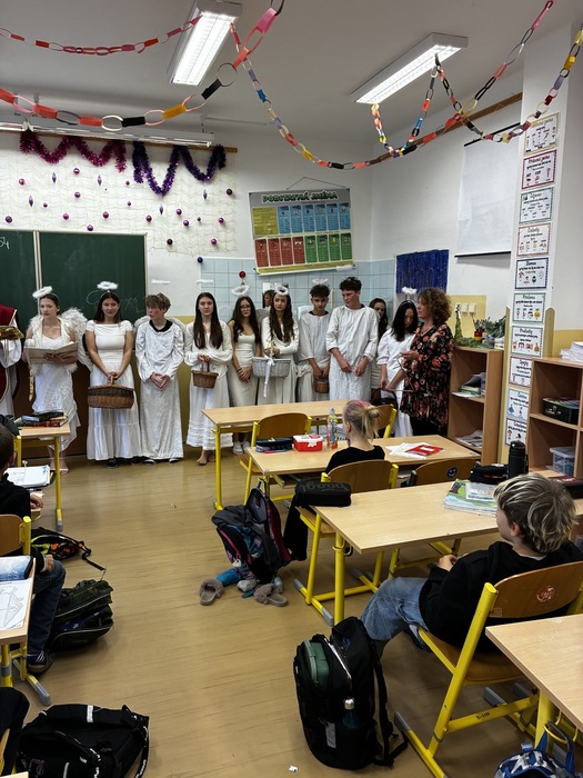 Také žáci prvního stupně ukázali, že se na Mikuláše poctivě připravili a nebáli se předvést, co umí. Letos byl mikulášský průvod obohacen o zpívajícího anděla, Terku Fencovou, která při vstupu do tříd zazpívala vánoční píseň a navodila tak příjemnou sváteční atmosféru. Za tento krásný hudební doprovod jí patří velké poděkování.