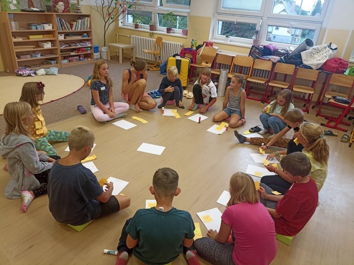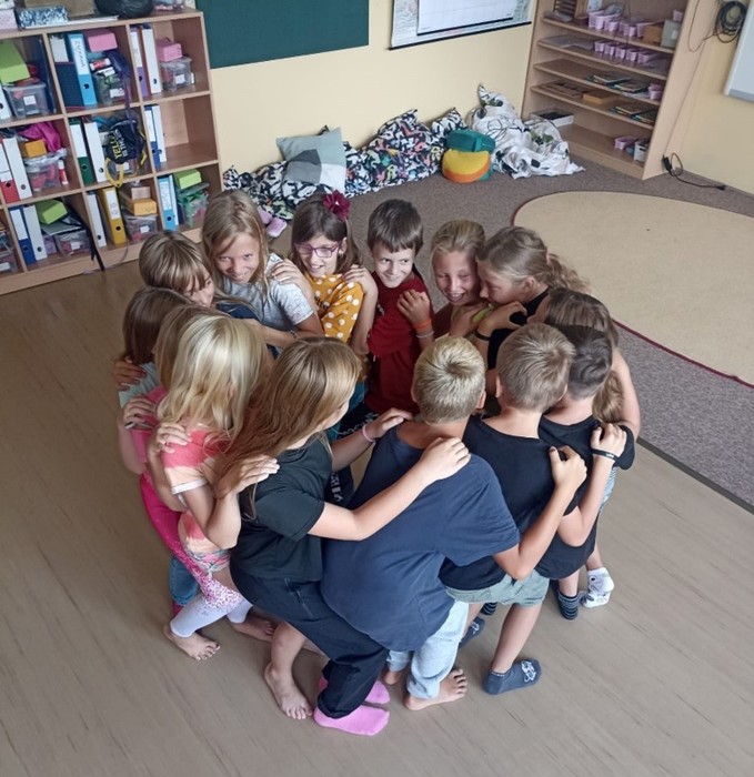 Společný čas jsme jen neprojedli, ale hráli jsme různé hry. Trénovali jsme spolupráci při vstávání ve dvojicích, důvěru při sedání si v kruhu důvěry. Poznávali se o trošku více při aktivitě Střihoruký Edvard, která nám umožnila odhalit naše silné stránky a dovednosti. Představili jsme si, co nás baví a co máme rádi při tvoření našich erbů. Někteří z nás překonali svůj strach či jiné nepříjemné pocity při noční procházce potemnělou školou... Ujasnili jsme si některá pravidla, která nám pomohou, abychom se společně cítili ve třídě dobře. V pátek jsme všichni odcházeli s úsměvy na rtech a natěšení na další seminář!