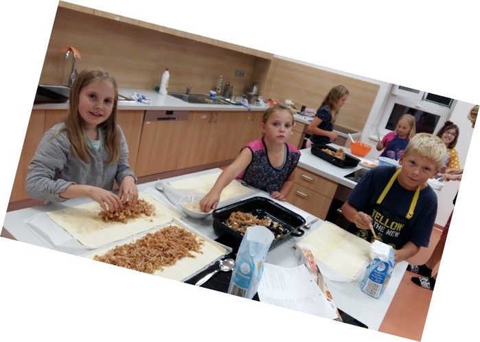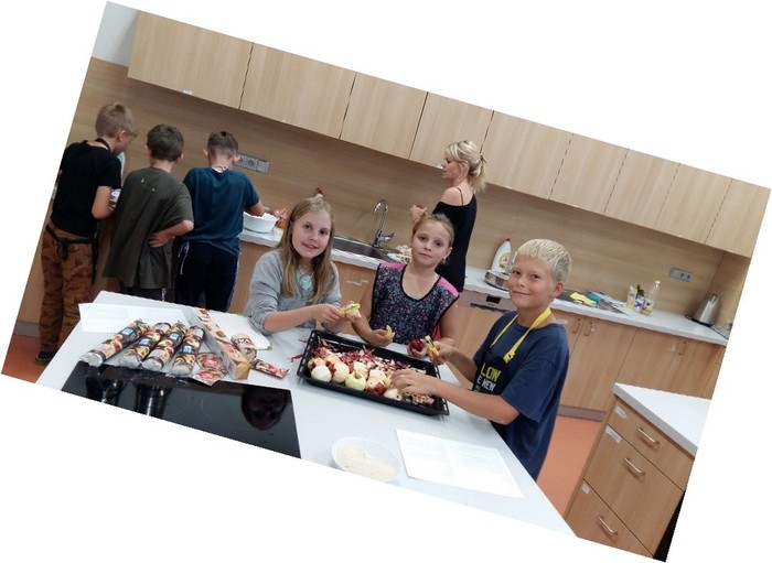 Tentokrát jsme se úplně nespoléhali na podporu rodičů, kteří nás vždy zásobují dobrotami, ale připravili jsme si je sami. Takže jsme si k večeři i na svačinu na druhý den nachystali vajíčkovou pomazánku a kluci umíchali různé lučinové pomazánkové variace. K snídani jsme upekli bábovku a čtyři nohavice jablečných štrůdlů. Z některých z nás se stali přeborníci na loupání, očišťování a strouhání jablíček a prokázali tak, že trpělivosti mají opravdu mnoho.