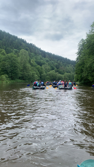 V pondělí 16. června jsme se autobusem vydali do Vyššího Brodu. Tam už na nás čekala paní instruktorka Marcela. Vysvětlila nám, jak se používá pádlo, a pravidla která máme na vodě dodržovat. Z Vyššího Brodu jsme vyjeli okolo půl desáté. Počasí nám moc nepřálo. Byla zima a pršelo, ale i tak jsme si to užívali, neboť to byl náš poslední společný výlet. Prví zastávka byla U Tří veverek. Zde jsme se posilnili různými dobrotami. Cesta byla ještě daleká, a všem byla zima. Proto se kluci rozhodli že nás ochladí ještě víc. Začala vodní bitva. Když jsme přijeli do kempu U Fíka, najedli jsme se, a večer jsme zpívali u ohně. Přidali se k nám další lidé s kytarami a bubny.